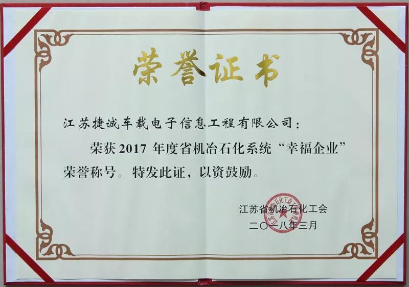 近日,航天通信江蘇捷誠公司榮獲2017年度江蘇省機冶石化系統“幸福企業”榮譽稱號。