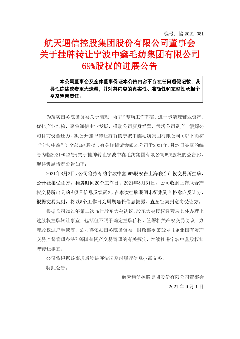 航天通信控股集團(tuán)股份有限公司關(guān)于掛牌轉(zhuǎn)讓寧波中鑫毛紡集團(tuán)有限公司69%股權(quán)的進(jìn)展公告